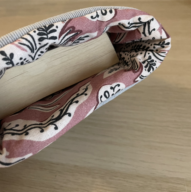 Upcyclée à partir de chutes de tissus: un velours gris souris et d'une doublure à fleur rose.