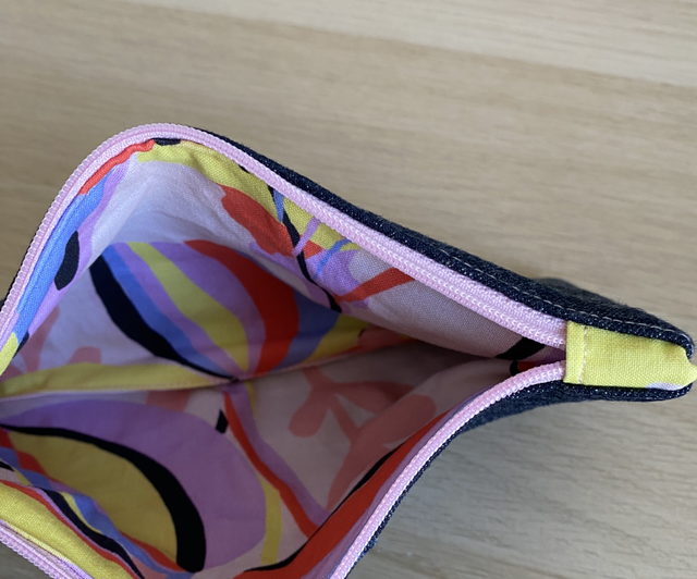 Elle est fait à partir de chute de jeans et animée d'une jolie doublure colorée.