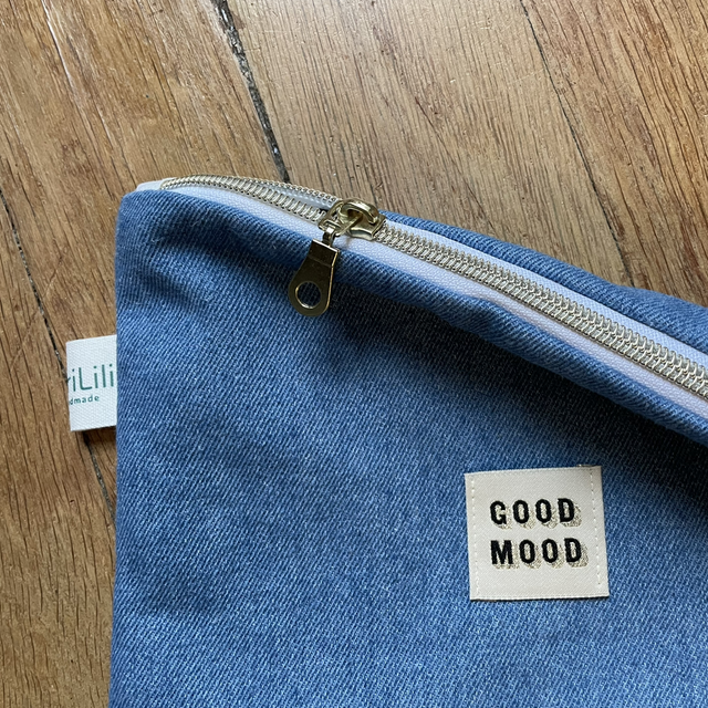 Elle est fait à partir de chute d'un jean et animée d'une jolie doublure léopard et d'une étiquette Good Mood.