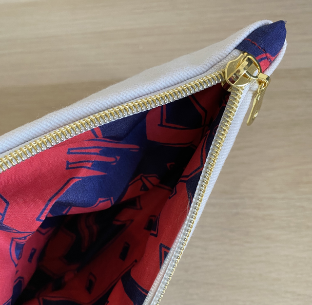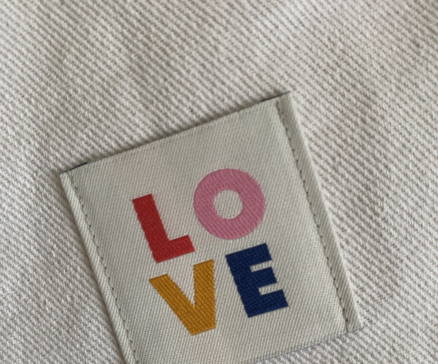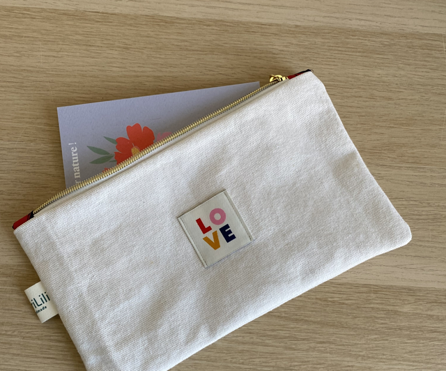 Elle est fait à partir d'un ancien jean blanc crème upcyclé et d'une doublure rouge et bleu marine, reliquat de tissu. Je lui ai ajouté une étiquette LOVE.