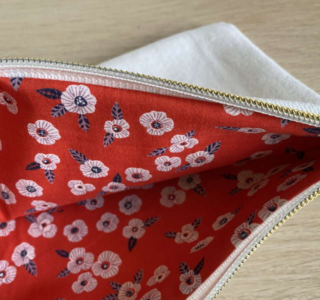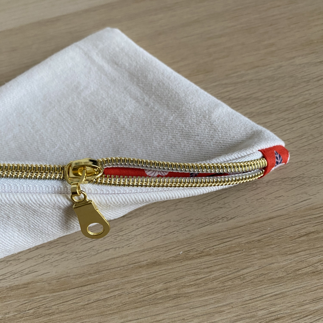 Elle est fait à partir d'un ancien jean blanc crème upcyclé et d'une doublure rouge à fleur, reliquat de tissu.